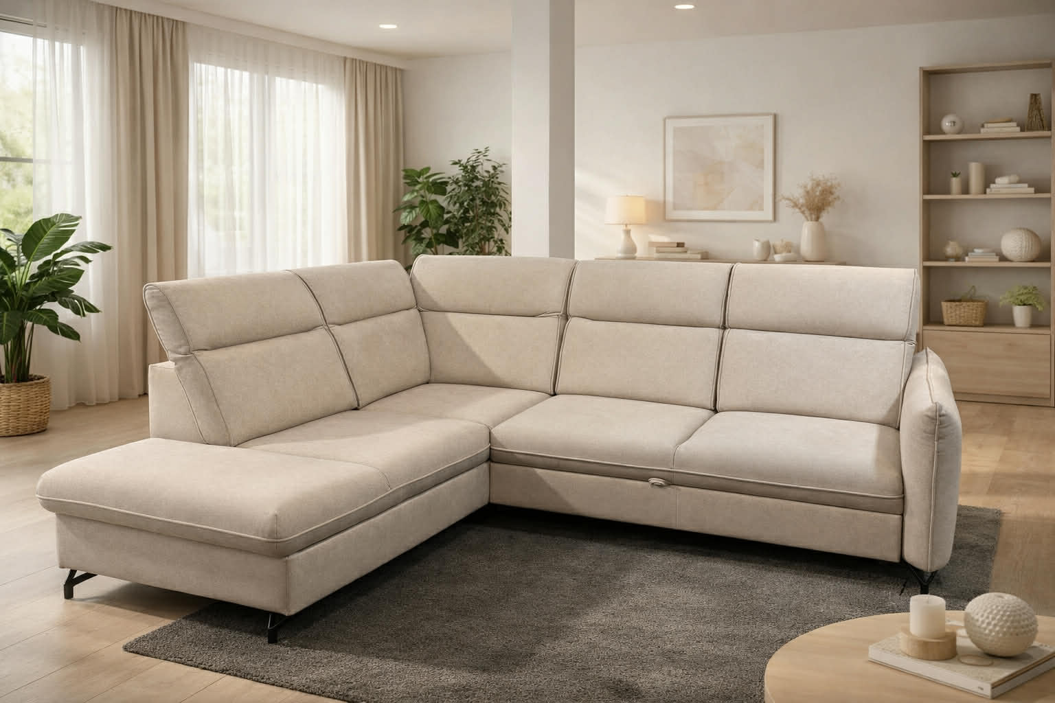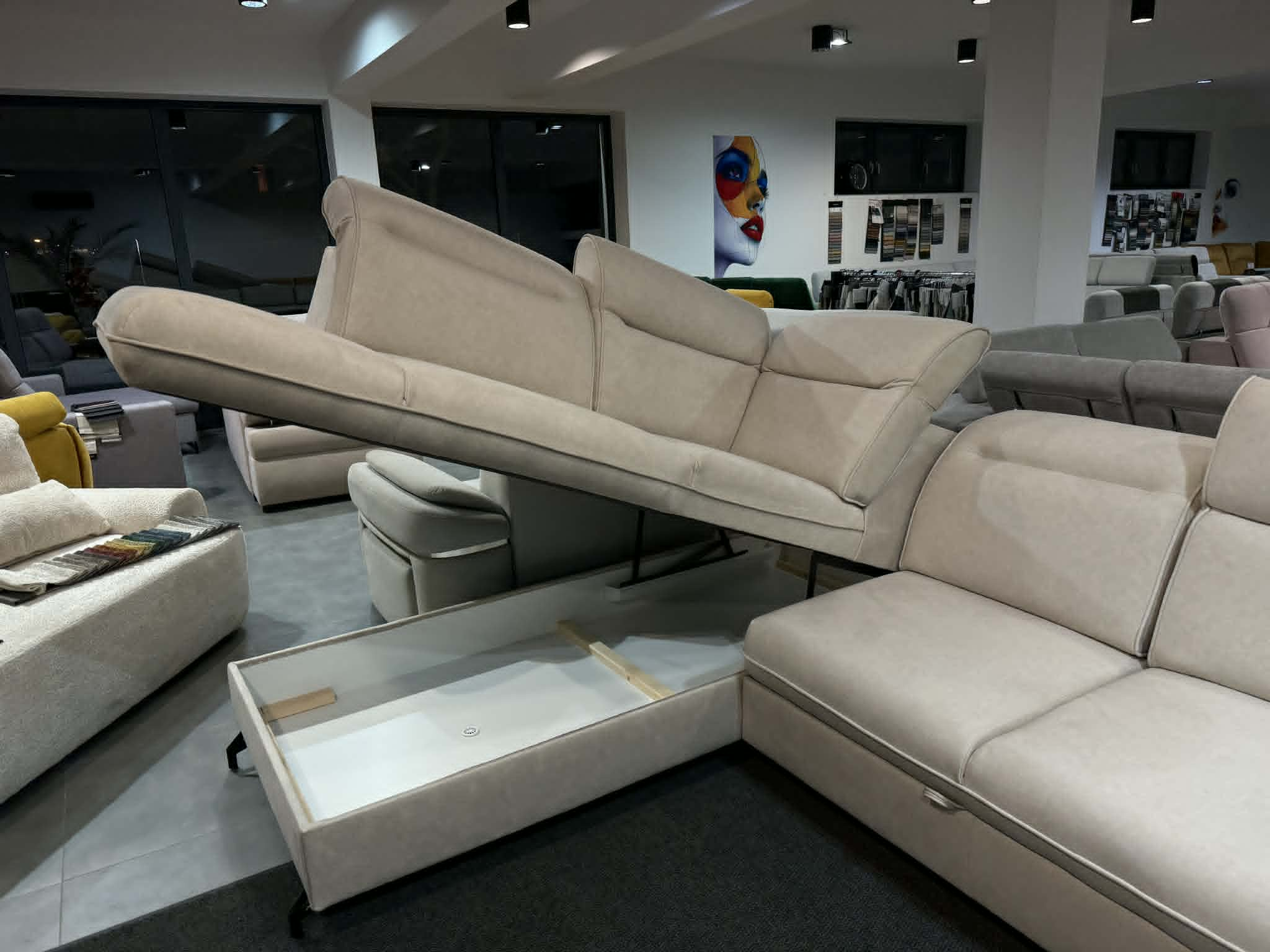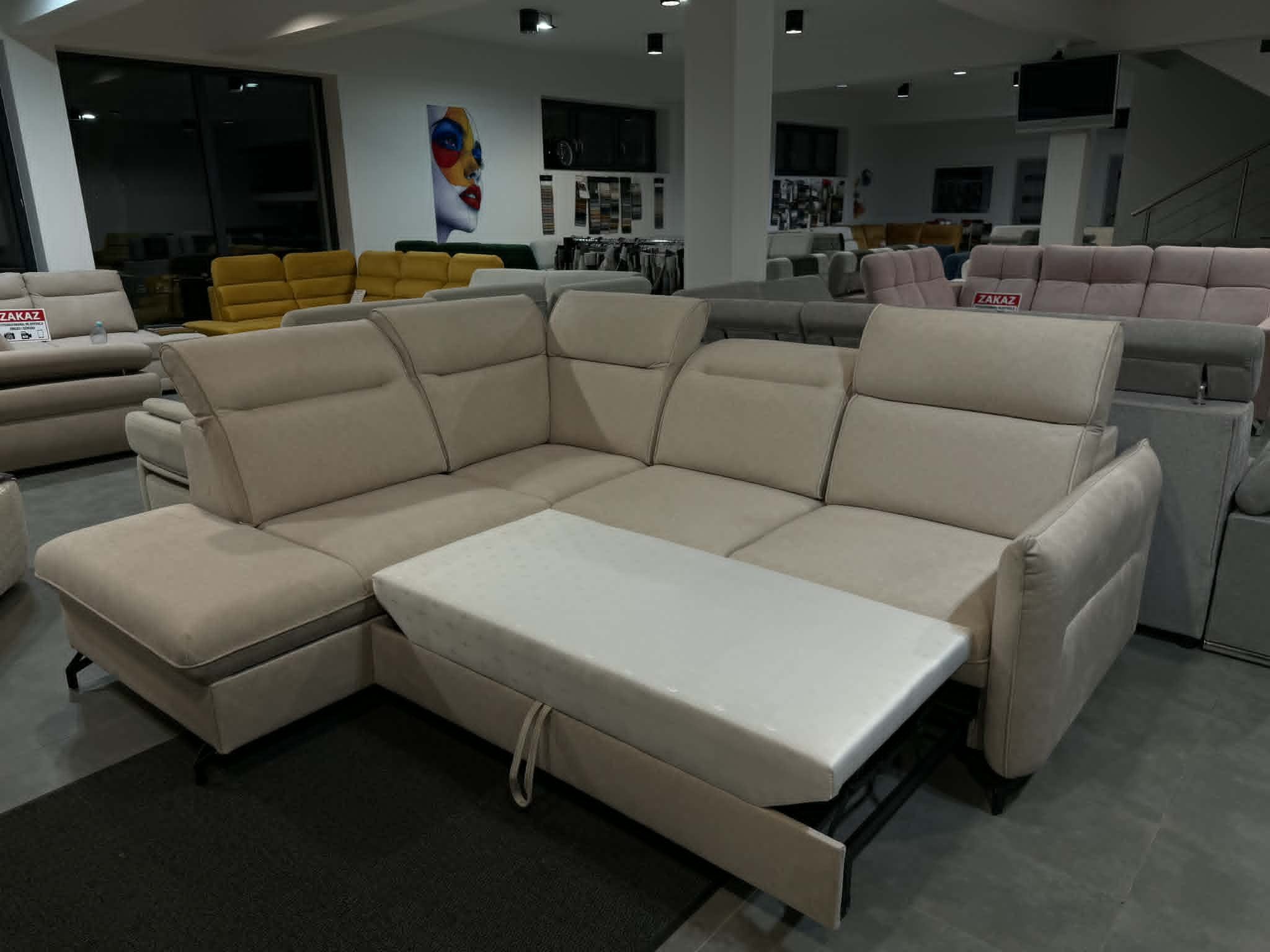 Narożnik wyposażony jest w wbudowane zagłówki regulowane, które pozwalają na indywidualne dopasowanie pozycji oparcia, zwiększając komfort wypoczynku. Konstrukcja narożnika została przystosowana do spania codziennego, zapewniając odpowiednie podparcie ciała i wysoki komfort snu. Praktyczny pojemnik na pościel umożliwia wygodne przechowywanie kołder i poduszek, pomagając utrzymać porządek w salonie. Solidne wykonanie oraz wysokiej jakości materiały gwarantują trwałość i wygodę użytkowania przez długie lata.