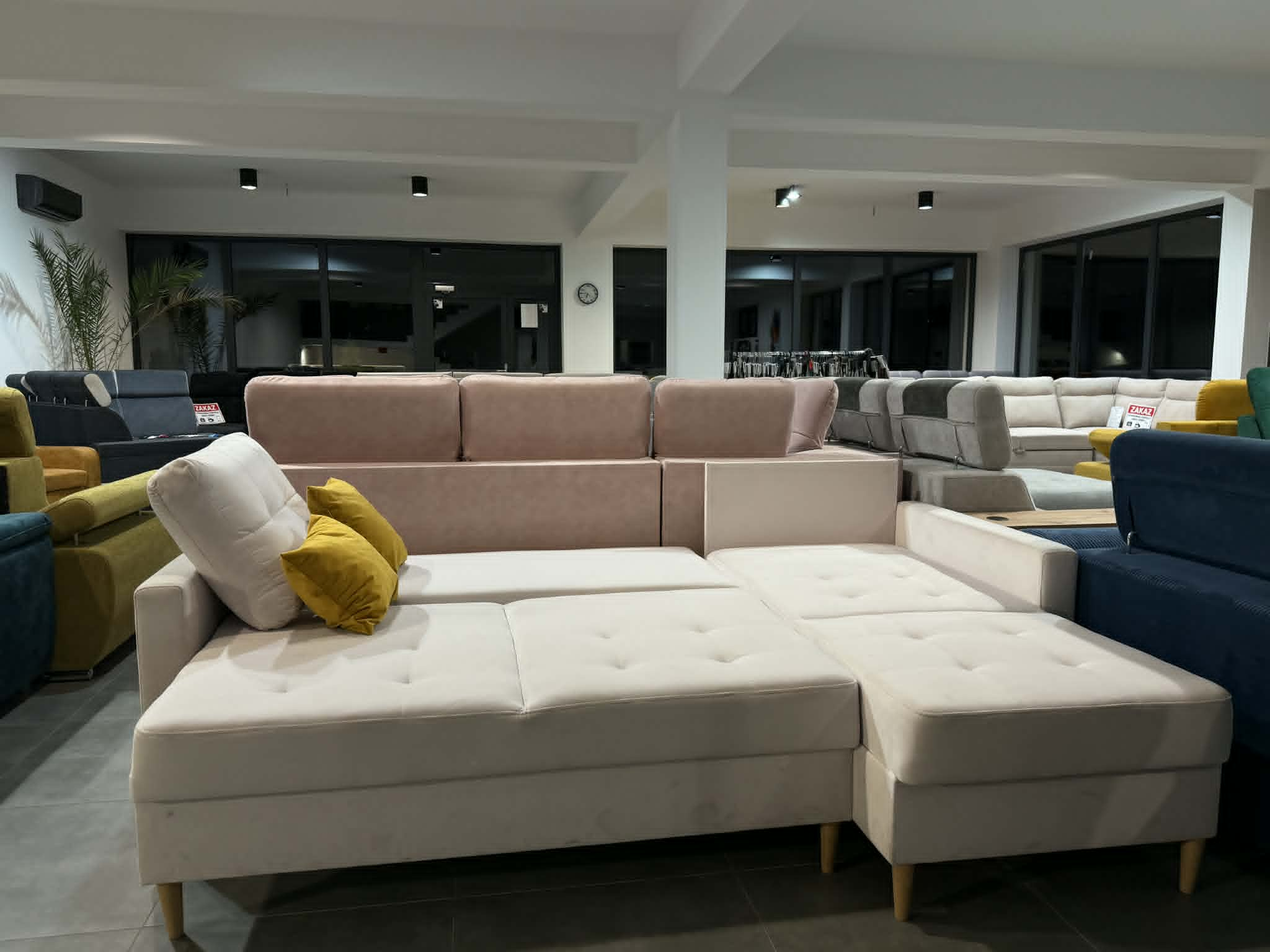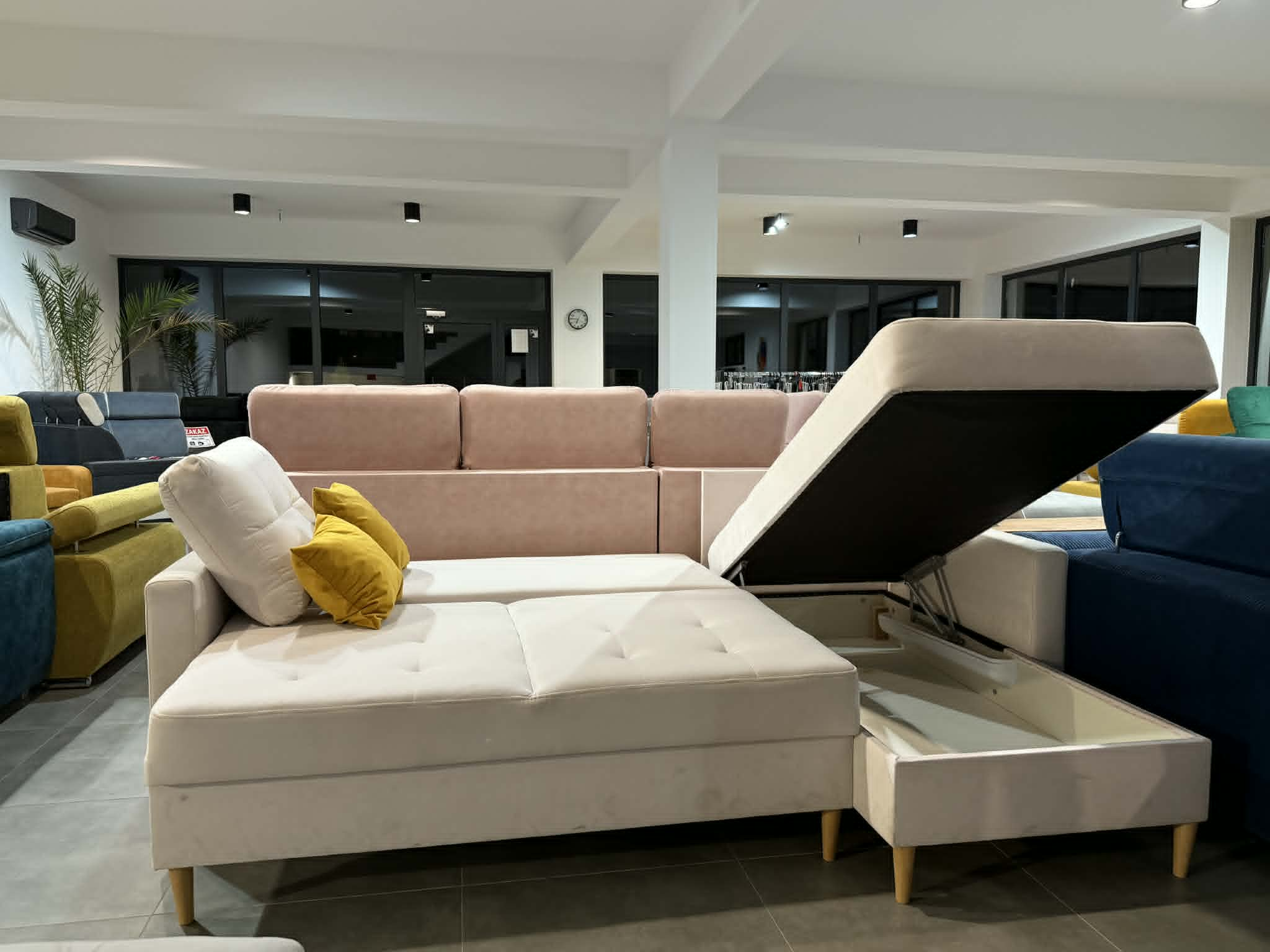 Model wyposażony jest w funkcję spania opartą na sprężynach bonellowych, co zapewnia wygodny i stabilny sen – również do codziennego użytkowania. Narożnik posiada aż dwa pojemniki na pościel, które umożliwiają wygodne przechowywanie tekstyliów i pomagają utrzymać porządek. Dzięki uniwersalnej konstrukcji narożnik jest ustawny – prawo lub lewostronny, co pozwala idealnie dopasować go do układu wnętrza. Istnieje również możliwość wykonania narożnika na pełnym siedzisku oraz na niskich nóżkach, co nadaje mu nowoczesny i estetyczny wygląd.