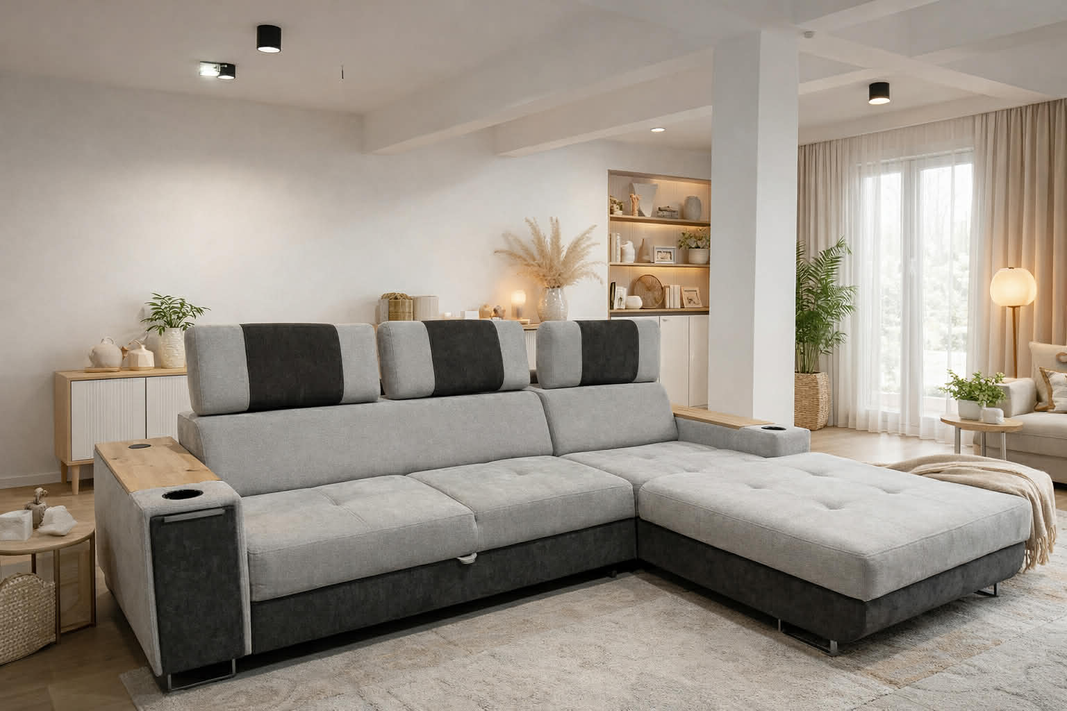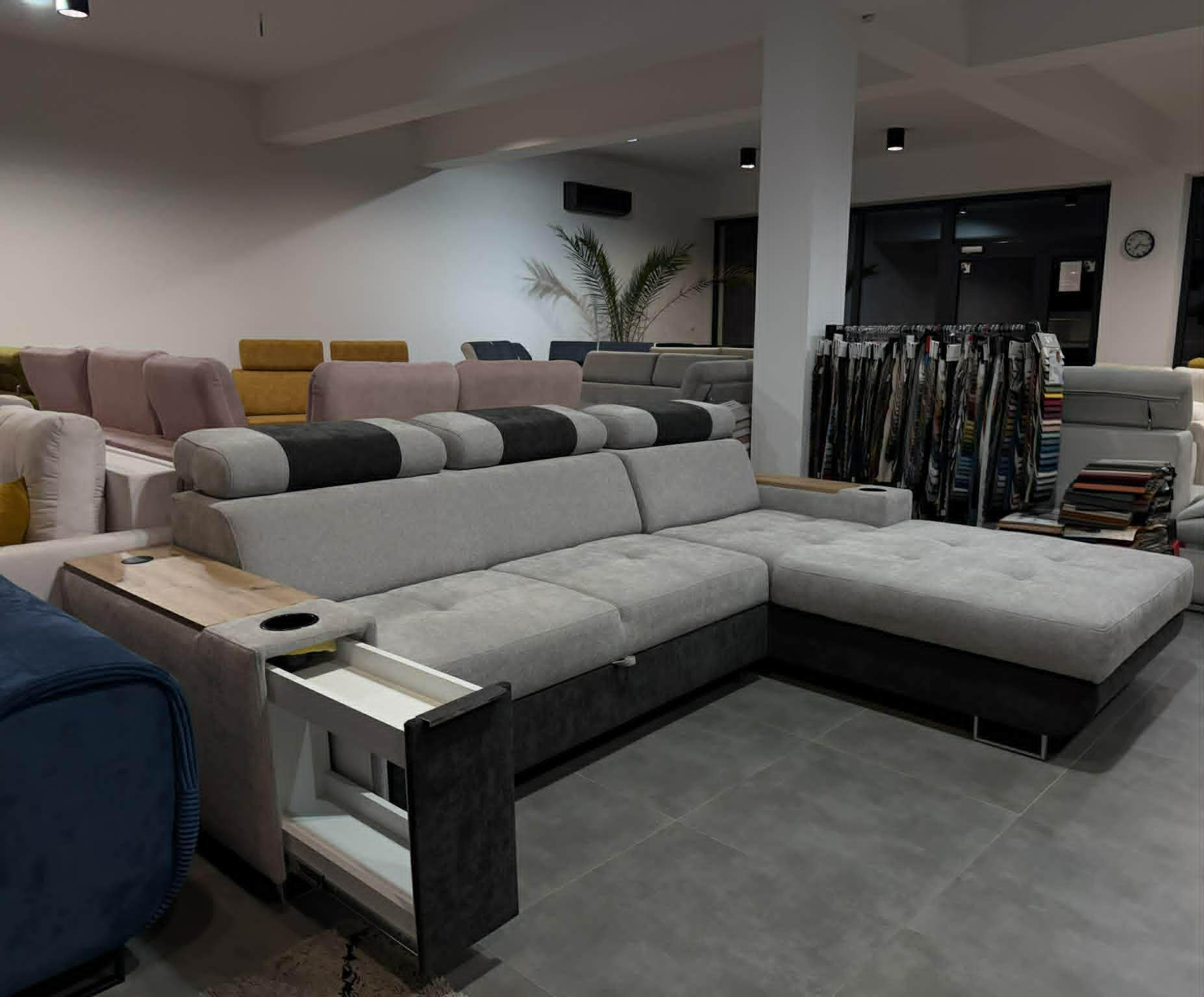 Narożnik SEVI to nowoczesny model zaprojektowany z myślą o osobach, które cenią komfort wypoczynku połączony z funkcjonalnymi, multimedialnymi rozwiązaniami. Idealnie sprawdzi się w salonach, gdzie narożnik pełni rolę centrum relaksu i rozrywki.Model wyposażony jest w funkcję spania, która pozwala na szybkie i wygodne rozłożenie narożnika, tworząc komfortową powierzchnię do snu. Zastosowanie sprężyn bonellowych zapewnia odpowiednie podparcie ciała, trwałość oraz wygodę użytkowania na co dzień. Narożnik posiada również pojemnik na pościel, ułatwiający przechowywanie tekstyliów.Dodatkowym atutem jest wbudowany bok multimedialny, który zwiększa funkcjonalność narożnika i podnosi komfort codziennego użytkowania. Konstrukcja umożliwia ustawienie narożnika w wersji prawej lub lewej, dzięki czemu łatwo dopasować go do układu pomieszczenia.