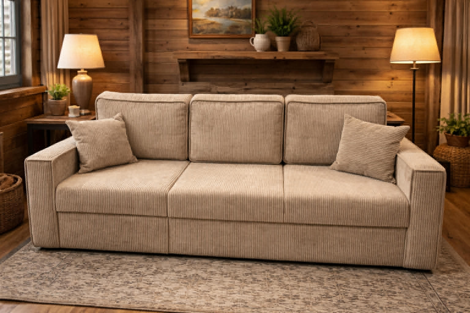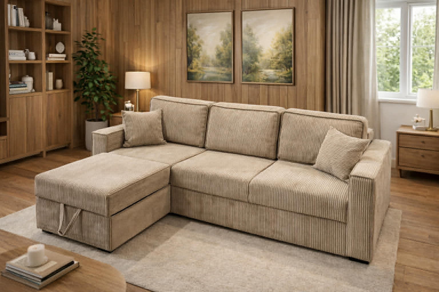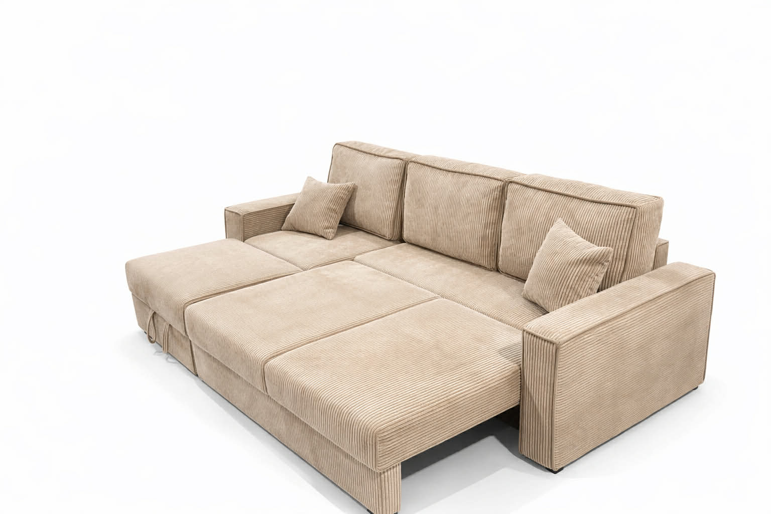 Dodatkowym atutem jest pojemny schowek na pościel, który ułatwia przechowywanie i pozwala zachować porządek w salonie. Model oferuje szerokie możliwości personalizacji – istnieje opcja zmiany wymiarów nóżek oraz boków, co pozwala dopasować wygląd mebla do indywidualnych preferencji i stylu wnętrza.