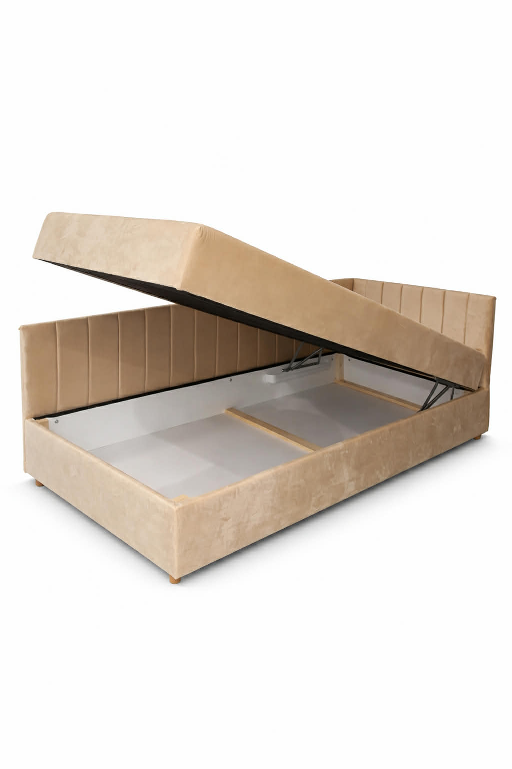 Dodatkowym atutem jest pojemny schowek na pościel, który pozwala na wygodne przechowywanie i lepszą organizację przestrzeni. Praktycznym rozwiązaniem jest również możliwość otwierania schowka zarówno od przodu, jak i od boku, co znacząco zwiększa komfort użytkowania i umożliwia dopasowanie mebla do układu pomieszczenia.