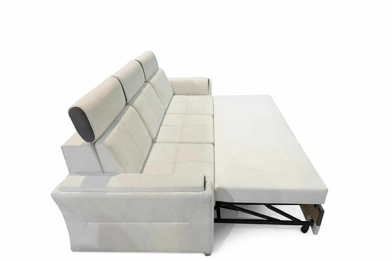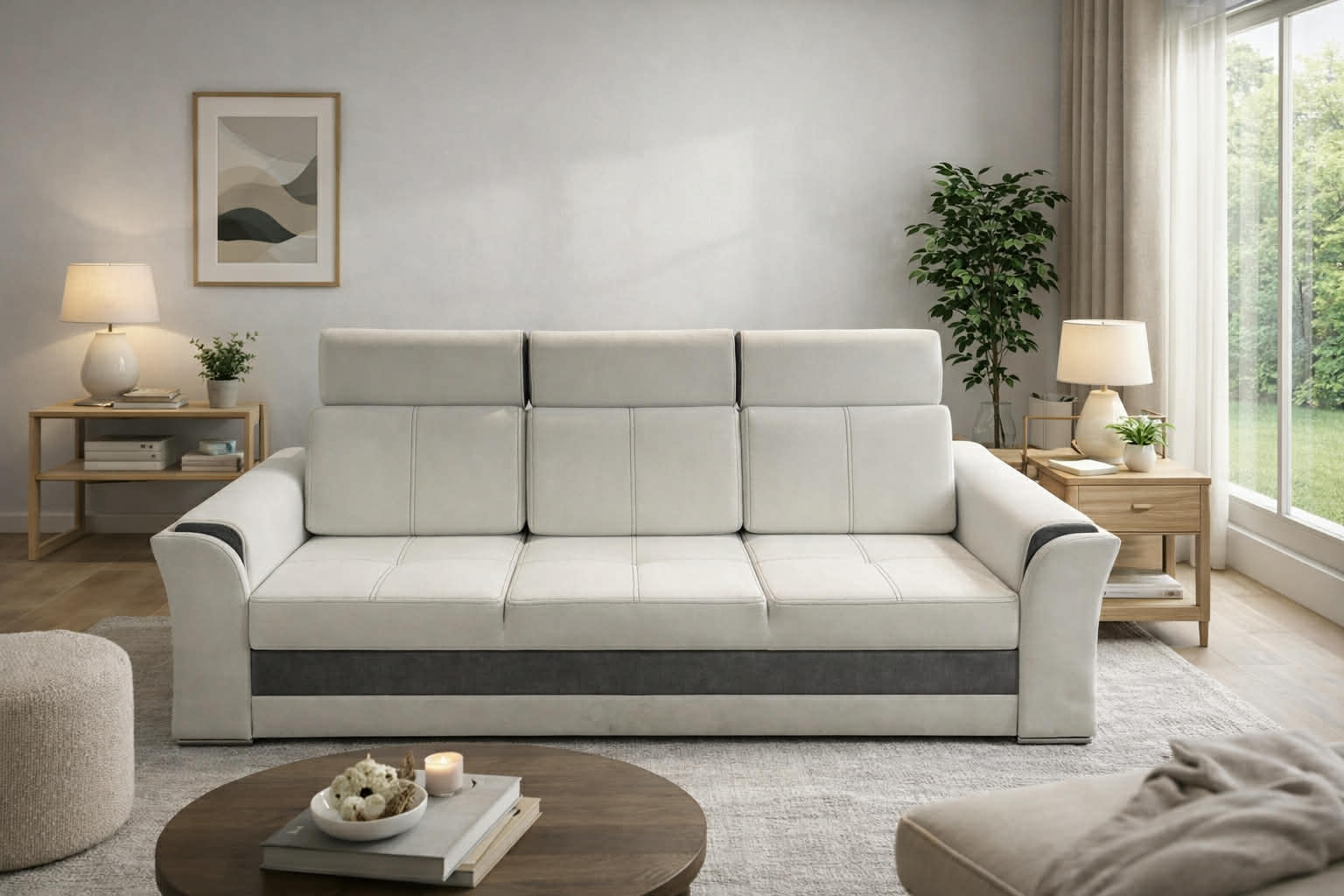 Sofa BONGO daje możliwość wyboru konfiguracji – klient może zdecydować się na funkcję spania lub pojemnik na pościel, w zależności od oczekiwań i sposobu użytkowania mebla. Dodatkowym atutem są regulowane zagłówki, które pozwalają na idealne dopasowanie pozycji siedzenia i zwiększają komfort wypoczynku.