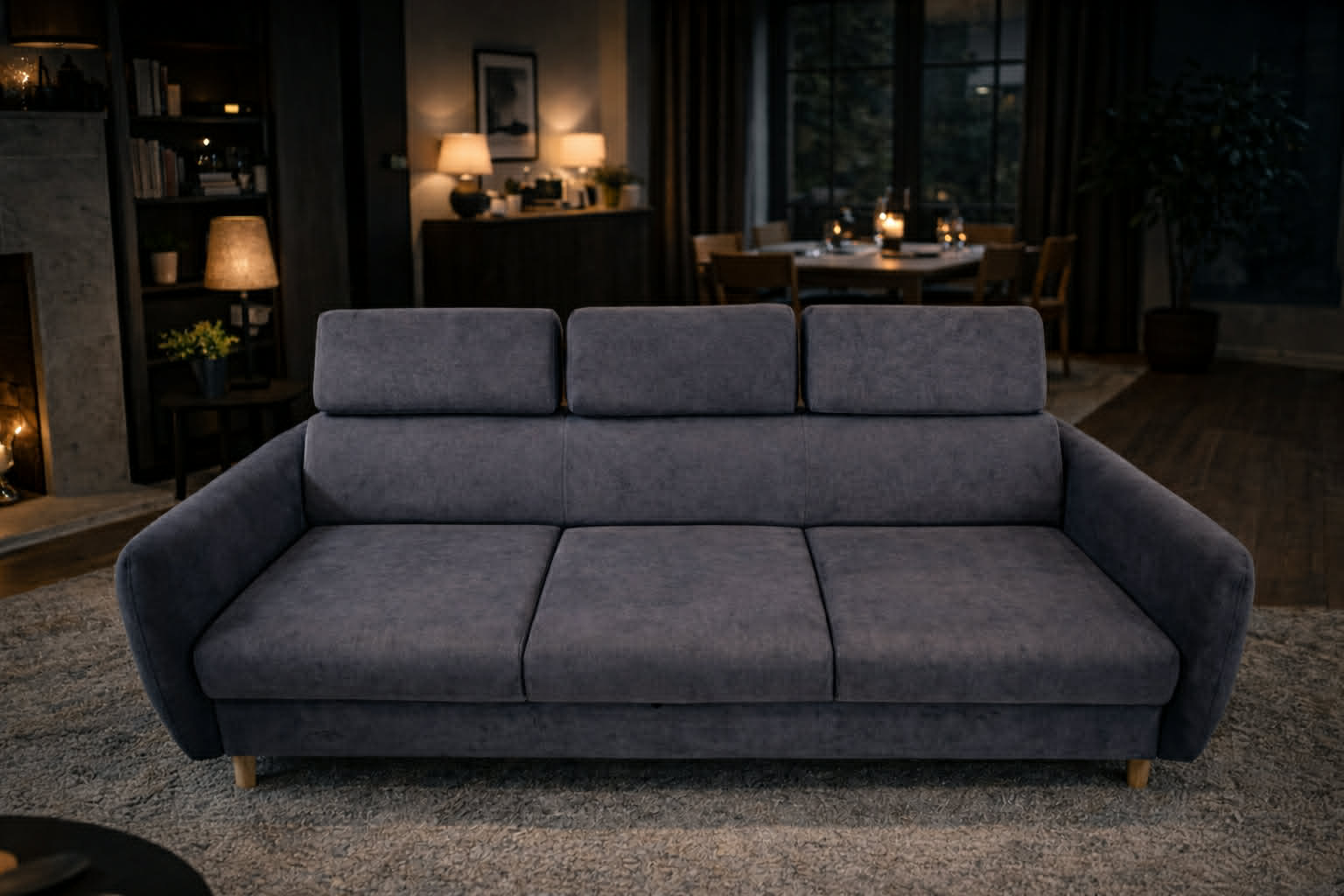 Model może zostać wyposażony w funkcję spania typu delfin, która zapewnia szybkie i wygodne rozkładanie. Po rozłożeniu sofa oferuje powierzchnię spania o wymiarach 190 × 135 cm, idealną do codziennego użytkowania. Komfort użytkowania podnoszą regulowane zagłówki, umożliwiające indywidualne dopasowanie pozycji siedzenia.